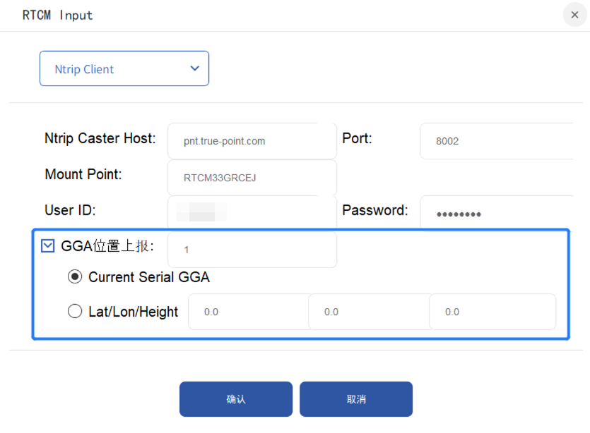 上报 GGA。对于需要生成虚拟参考站的网络 RTK 服务,必须勾选 GGA位置上报。上报频率默认为每 1 秒上报一次,用户可按需设置。上报位置可选择当前串口输出的 GGA,也可以手动输入纬度、经度、高程信息。