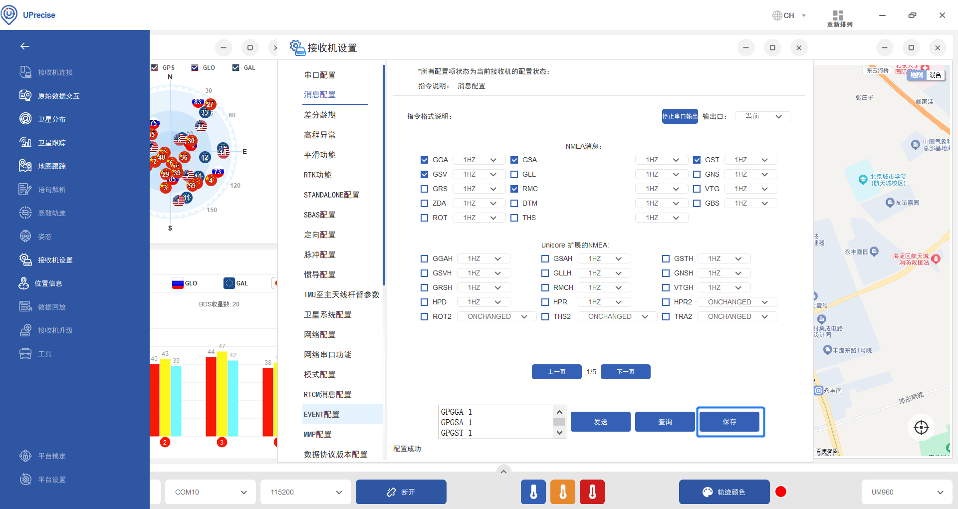 为保证 卫星分布、卫星跟踪 窗口正常显示,以及定位功能正常使用,建议配置接收机输出 NMEA GGA、GSA、GSV、GST 和 RMC 消息。