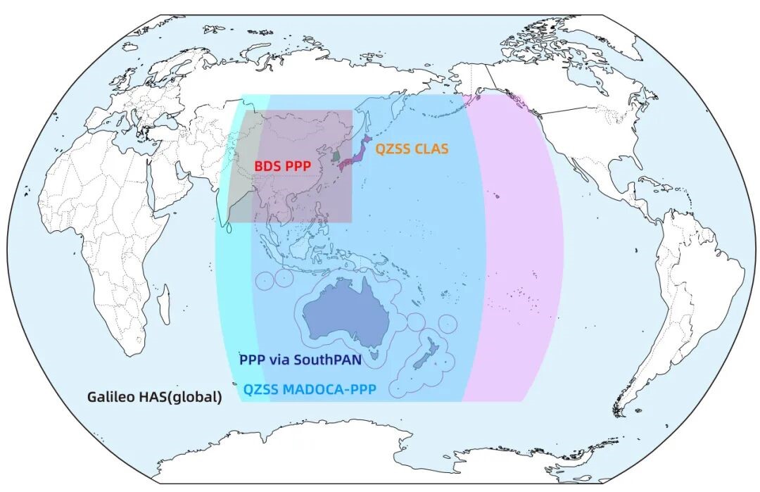目前可以提供免费PPP服务的有基于北斗卫星导航系统B2b频点覆盖亚太区域的PPP服务,基于Galileo系统 E6频点提供的 HAS全球服务,基于QZSS系统 L6E频点覆盖亚太、澳洲的MADOCA-PPP服务,及覆盖澳洲和新西兰区域的SouthPAN L5 PVS服务。