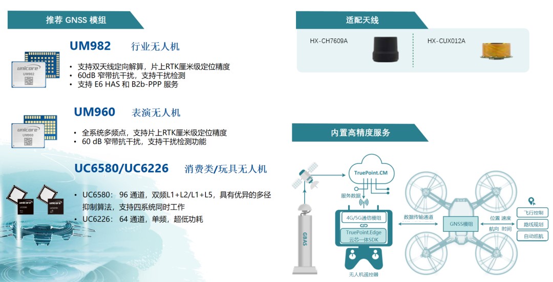 无人机领域因应用场景复杂,应用需求差异大,和芯星通为行业无人机、表演无人机、大众消费无人机以及玩具类无人机各细分产品线,分别搭配UM982双天线高精度定位定向模块、UM960小尺寸高精度定位模块、以及标准精度的UFirebirdⅡ双频芯片和UFirebird单频芯片方案,充分考虑客户对产品性能、尺寸、功耗、成本各方面综合需求。